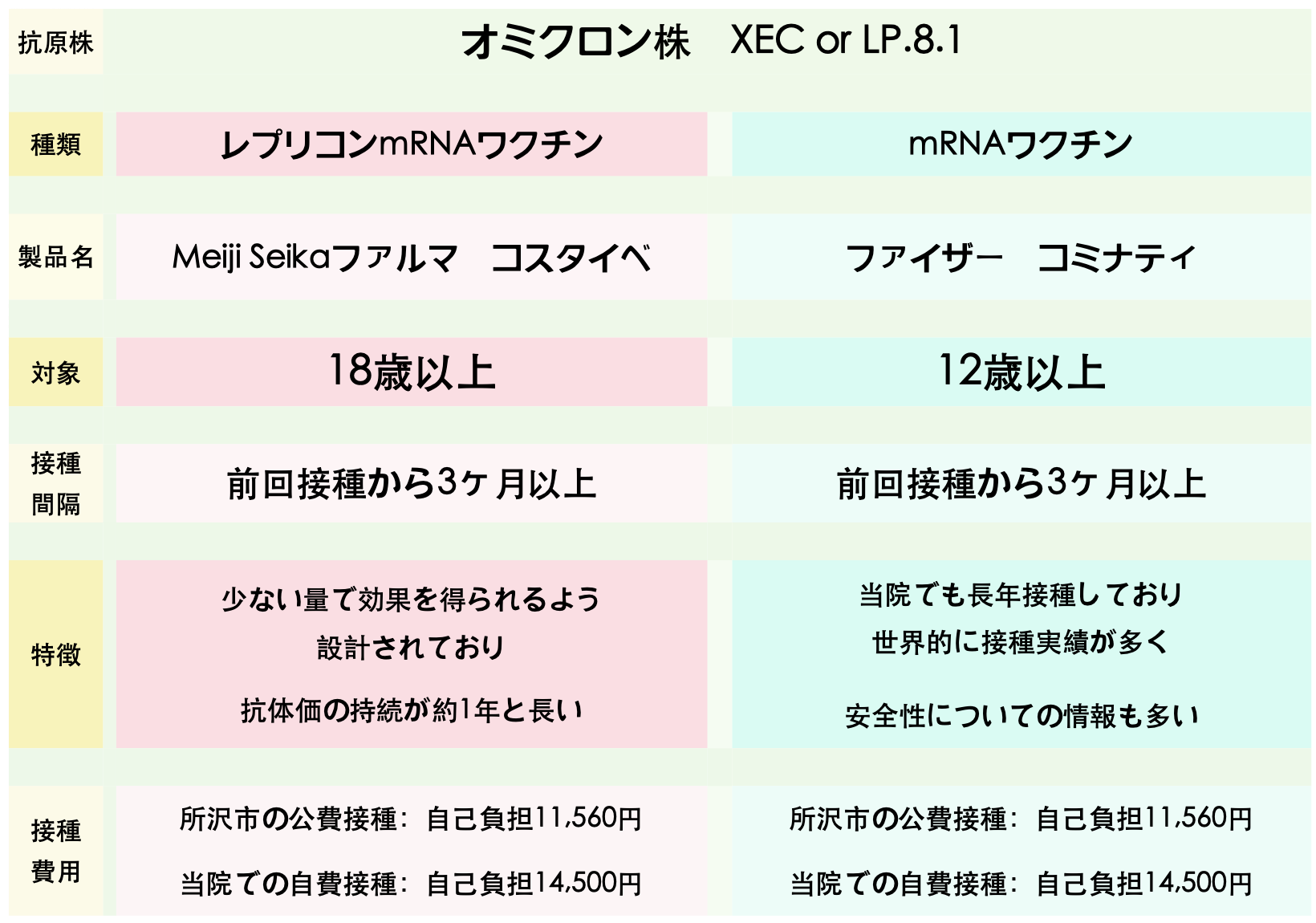 コロナワクチンは本年度より当院では従来のファイザー社製の「コミナティワクチンと」、Meiji Seikaファルマ製の「コスタイベワクチン」の2種類の選択が出来ます。両方のワクチンを比較していただいてご希望のワクチンを予約してください。